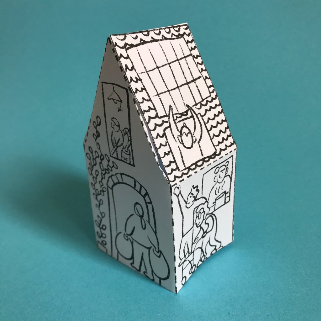 A while ago I made some coloring pictures for an exhibition about self organisation at fhxb_museum. One of them can be turned into a little 3-D house.