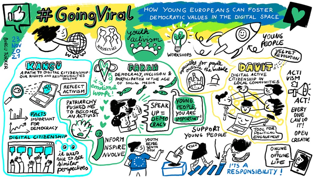 Key Visual and Graphic Recording for the event „#GoingViral: how young Europeans can foster democratic values in the digital space“ by Understanding Europe.