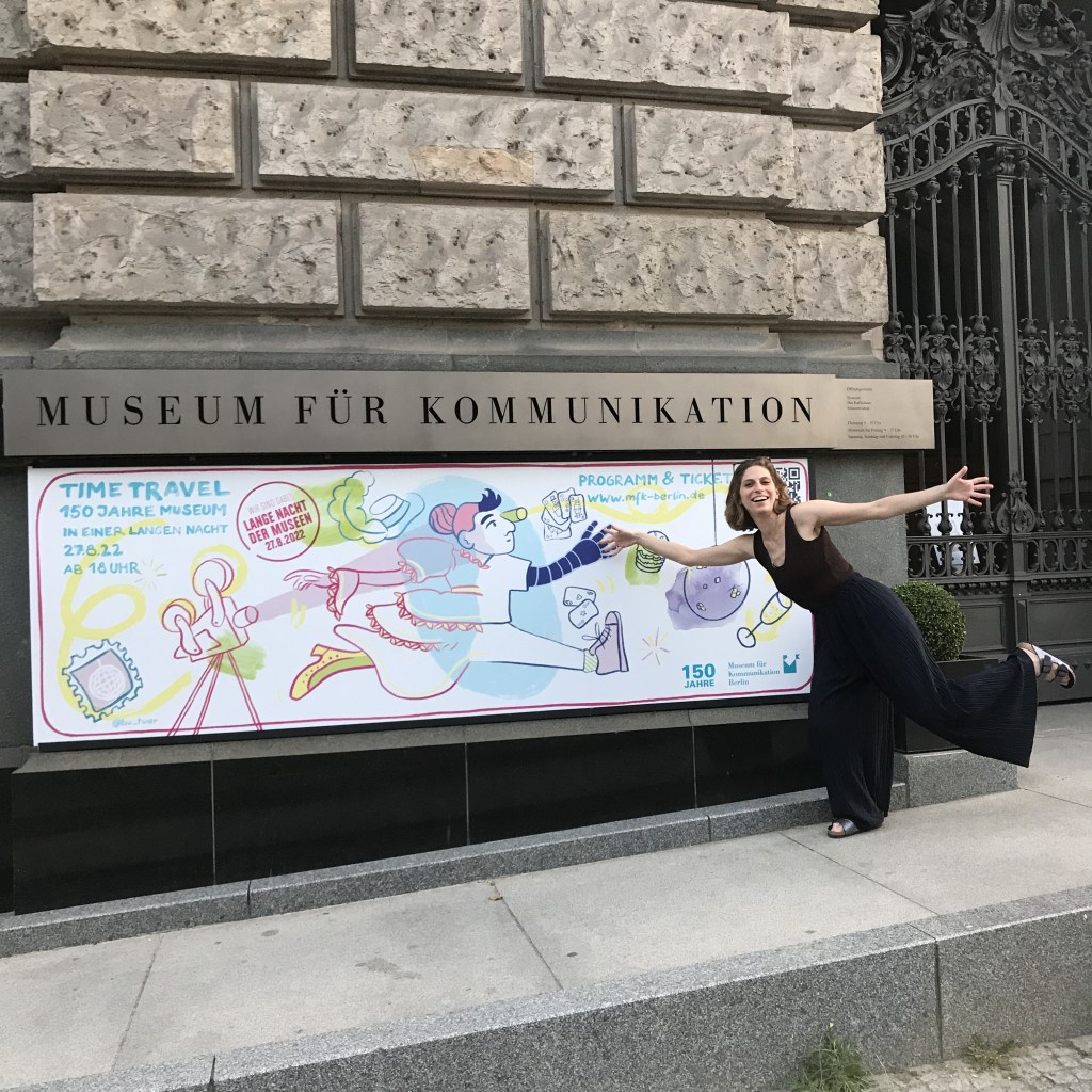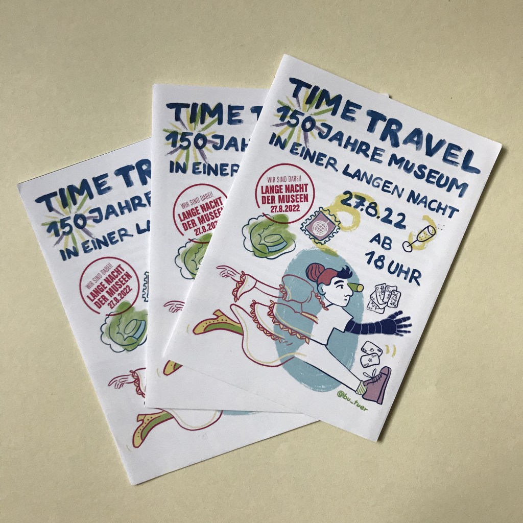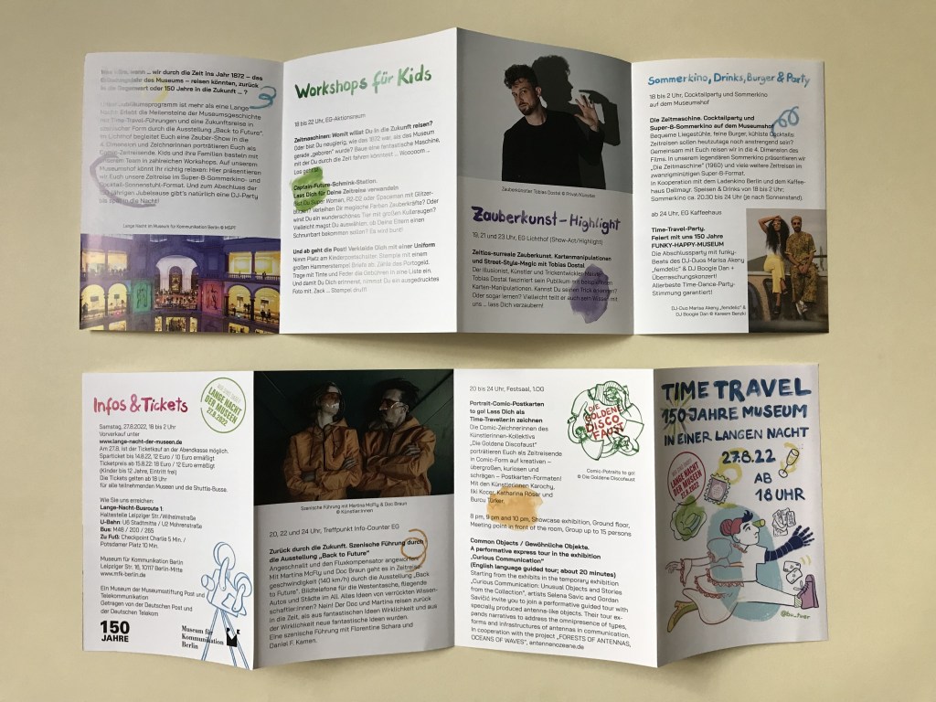 Für die Lange Nacht der Museen 2022 im Museum für Kommunikation habe ich das Visual für die Außentafel und das Programmheft gezeichnet.